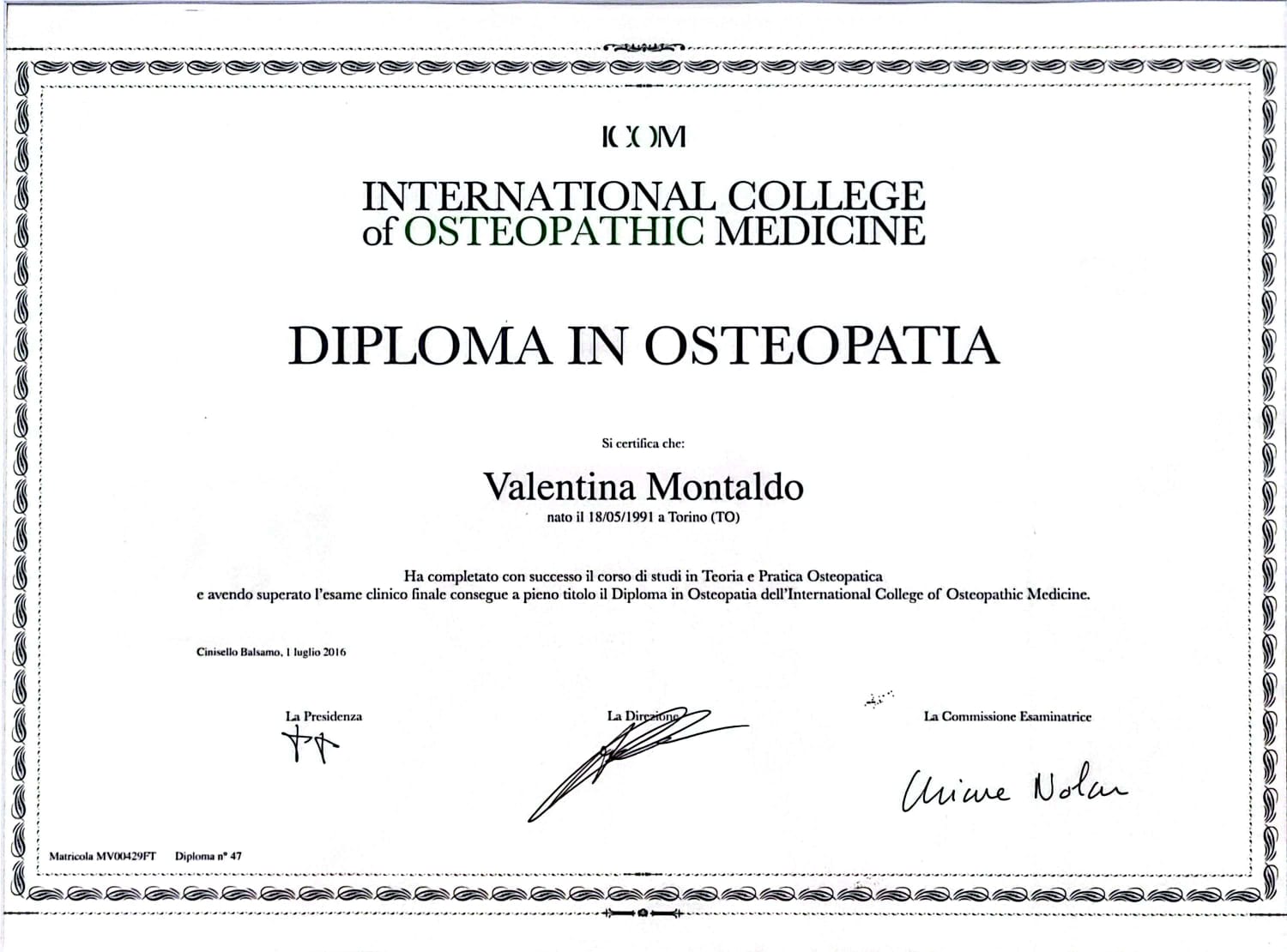 Osteopata specializzata nel trattamento dei disturbi cervicali e in osteo-odontoiatria. Laureata all’ International College of Osteopathic Medicine, di Milano, con Master in Scienze dell’Osteopatia del Surrey Institute of Osteopathic Medicine (SIOM) della Nescot College, Londra. Creatrice del Metodo Montaldo e di Progetto ColloSereno.